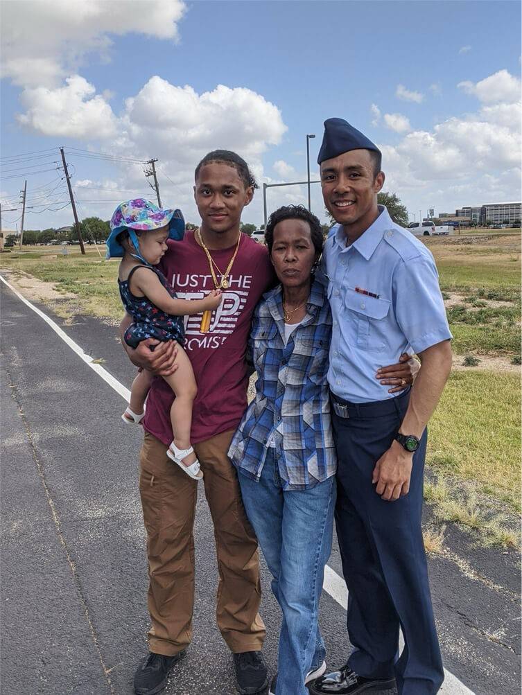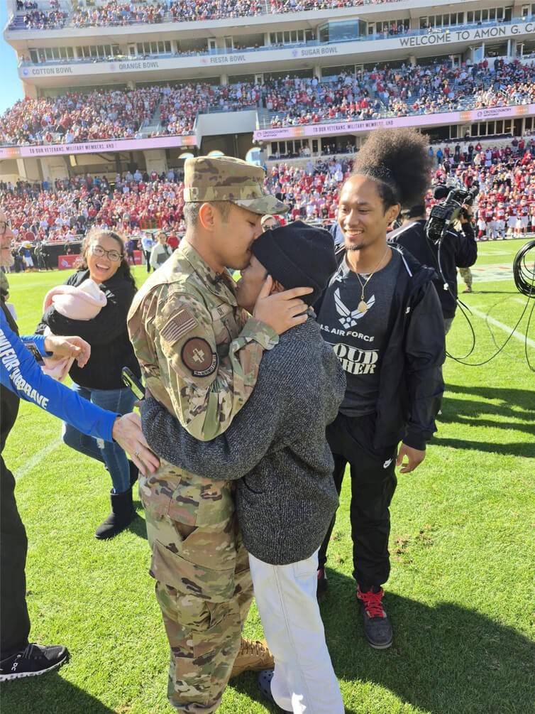 45,000 fans watched Aaron Bach walk out onto Amon G. Carter Stadium field to surprise his family at the Armed Forces Bowl held recently in Fort Worth, Texas. The senior airman took several strides toward midfield before opening his arms to embrace the family running towards him – two nieces and his younger brother David. But he saved the tightest hug for his mother, Thu Thi Ho, who is battling stage 4 breast cancer.