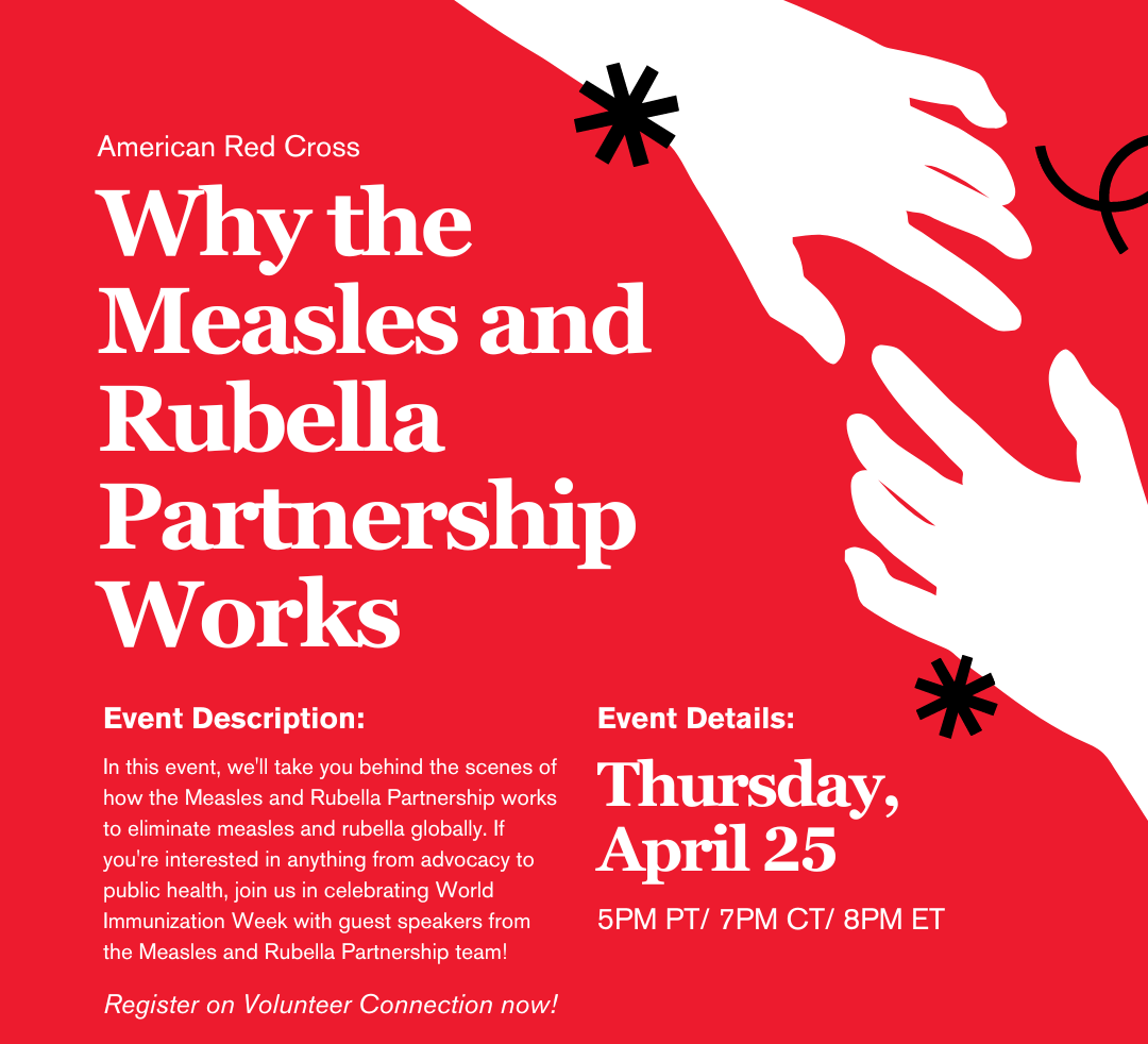 Join us this Thursday, April 25 for the National Youth Council (NYC) Measles and Rubella Partnership - an initiative that delves deep into our collective efforts to eliminate measles and rubella on a global scale! This event aims to raise awareness about the importance of vaccinations and the ongoing efforts to achieve this goal. Our esteemed guest speakers will share their expertise, experiences, and insights into the challenges and triumphs of combating these infectious diseases.